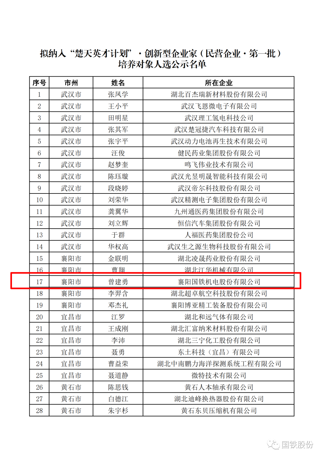 喜報!國鐵機電董事長曾建勇入選“楚天英才計劃”·創(chuàng)新型企業(yè)家培養(yǎng)對象